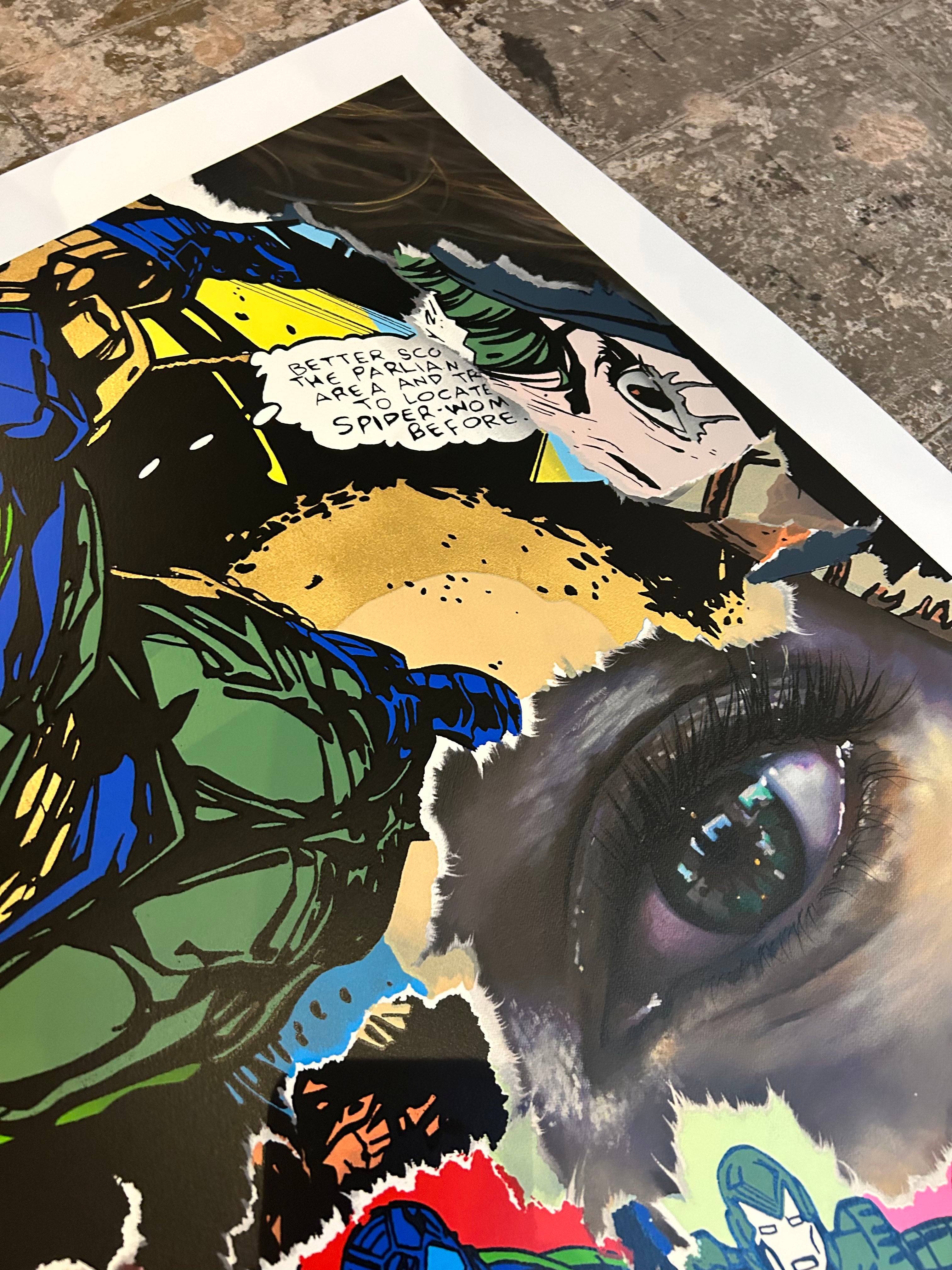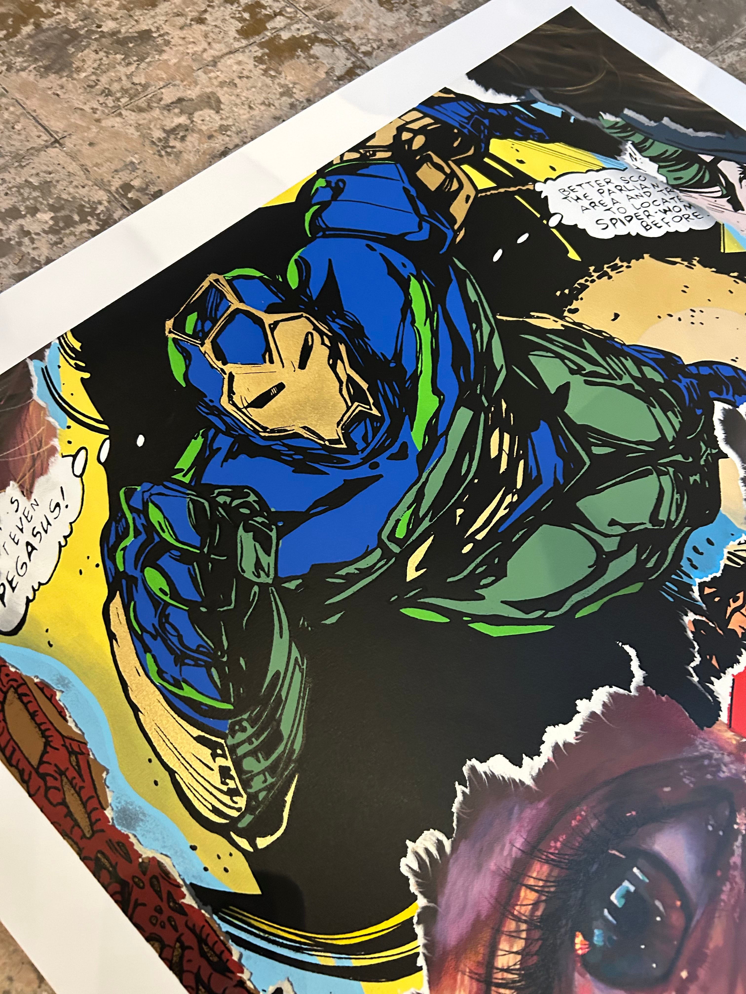 Archival Pigment Print On 300 gsm Somerset paper with 27 Colour Screen Print on top with gold leaf