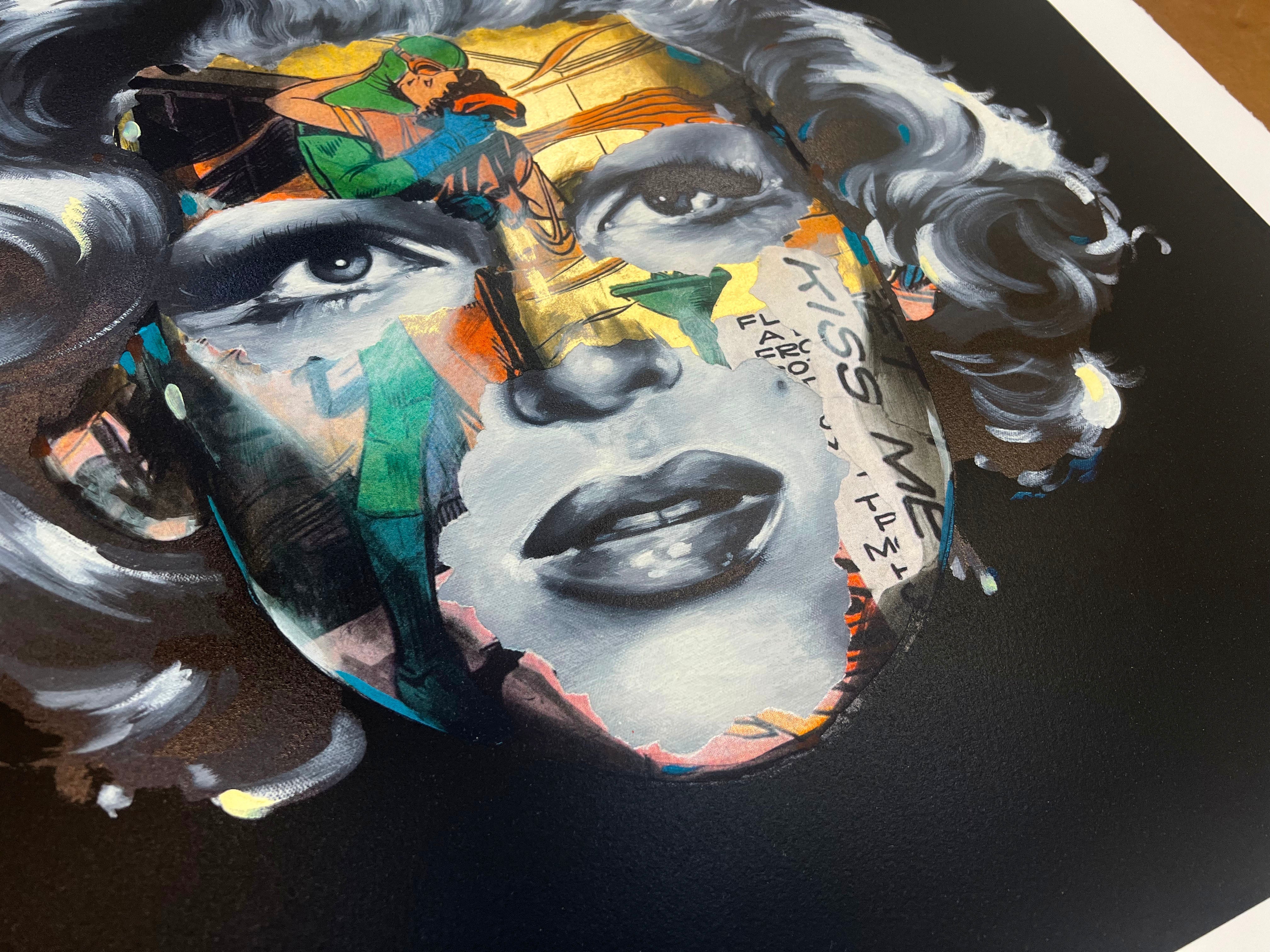 Archival Pigment Print On 410 gsm Somerset Paper with 7 colour screen print.gold leaf applied at the start of printing process to lock it under all the layers of ink at the end. (a very complicated process)