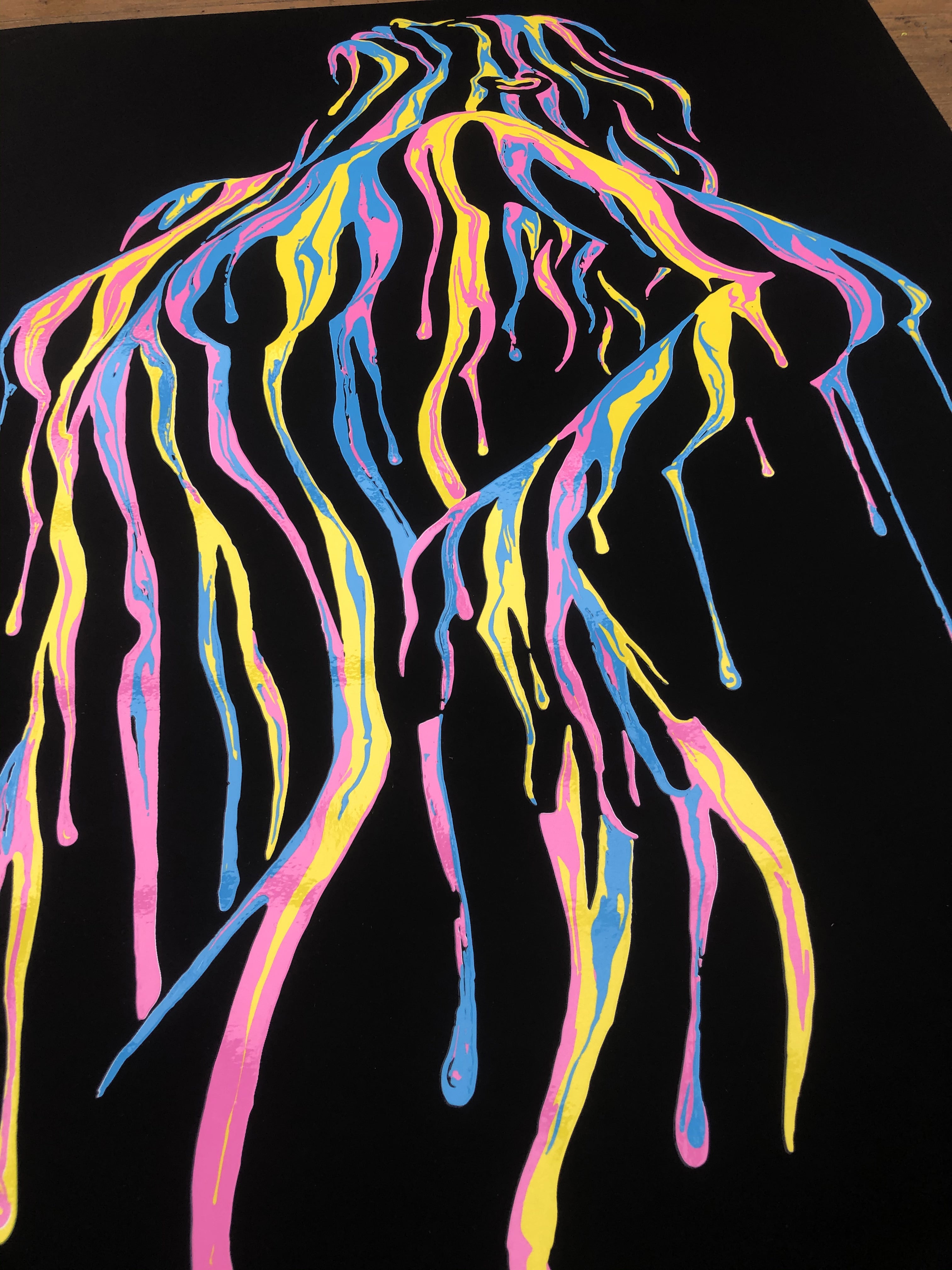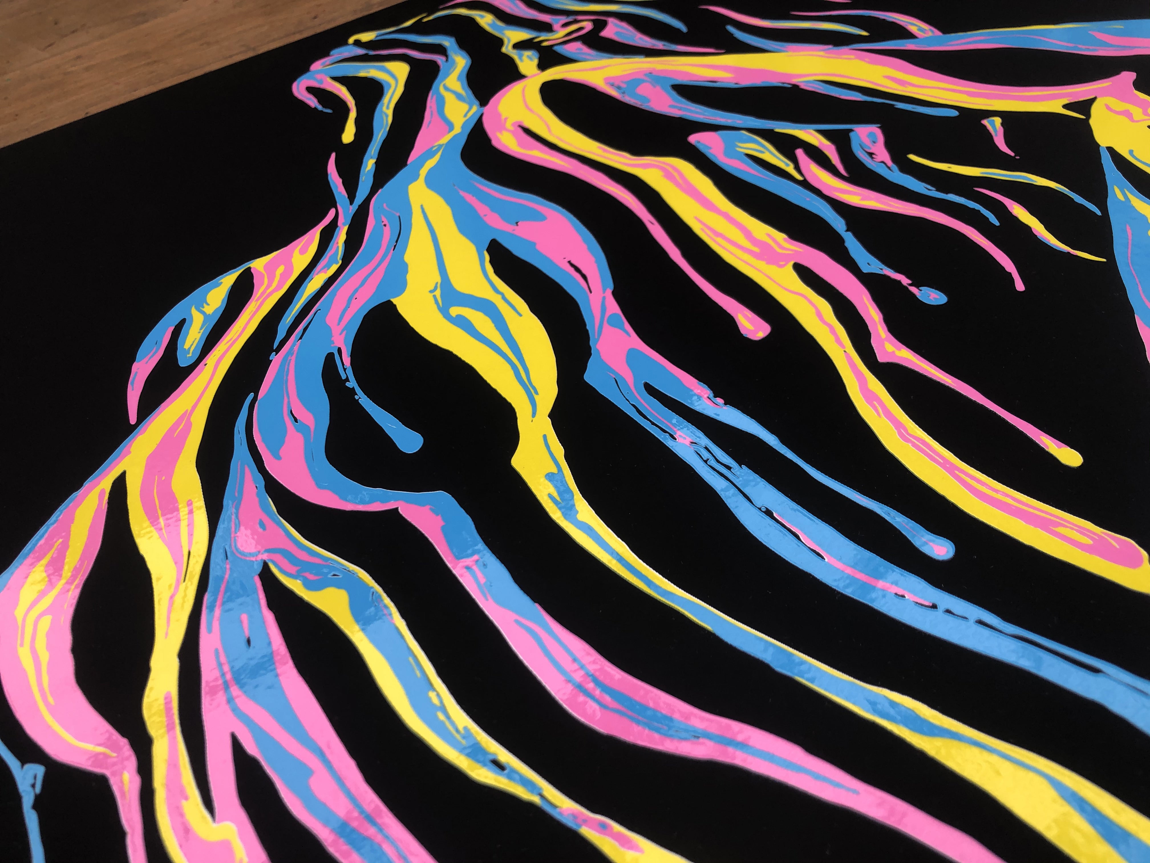 Special Raised Inks making ink around 1-2 mm high as the acrylic paint on his original paintings