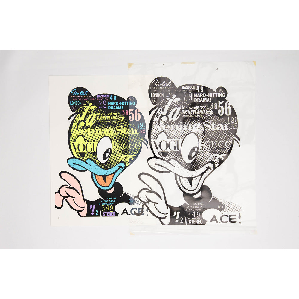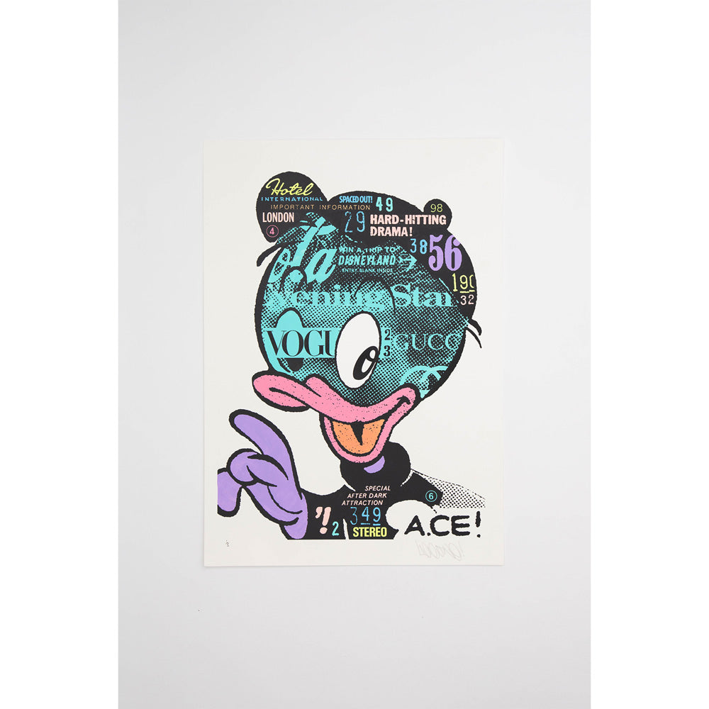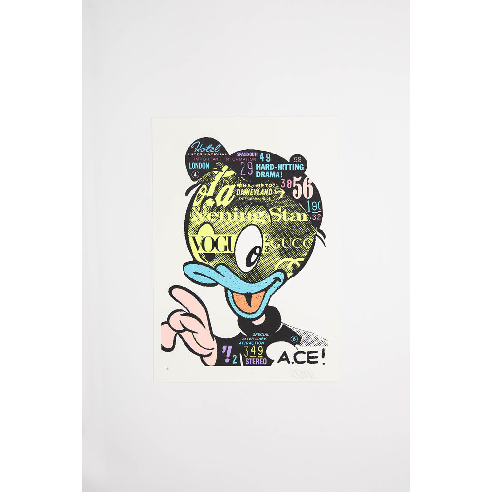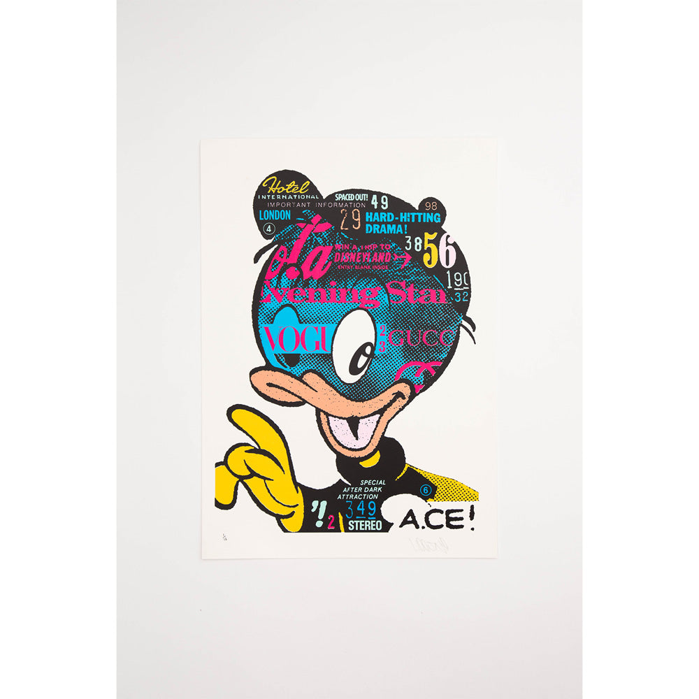A.CE is a London based artist. His instantly recognisable wheat-pasted images as well as his bold signature style have featured prominently across UK urban landscape. A.CE’s work is a raw presentation of nostalgic imagery intuitively selected, blended and remixed with contemporary fragments, resulting in a new narrative with ambiguities and incongruities, humor and messages that reflect the absurdities of popular culture and a media-rich consumer drive society.