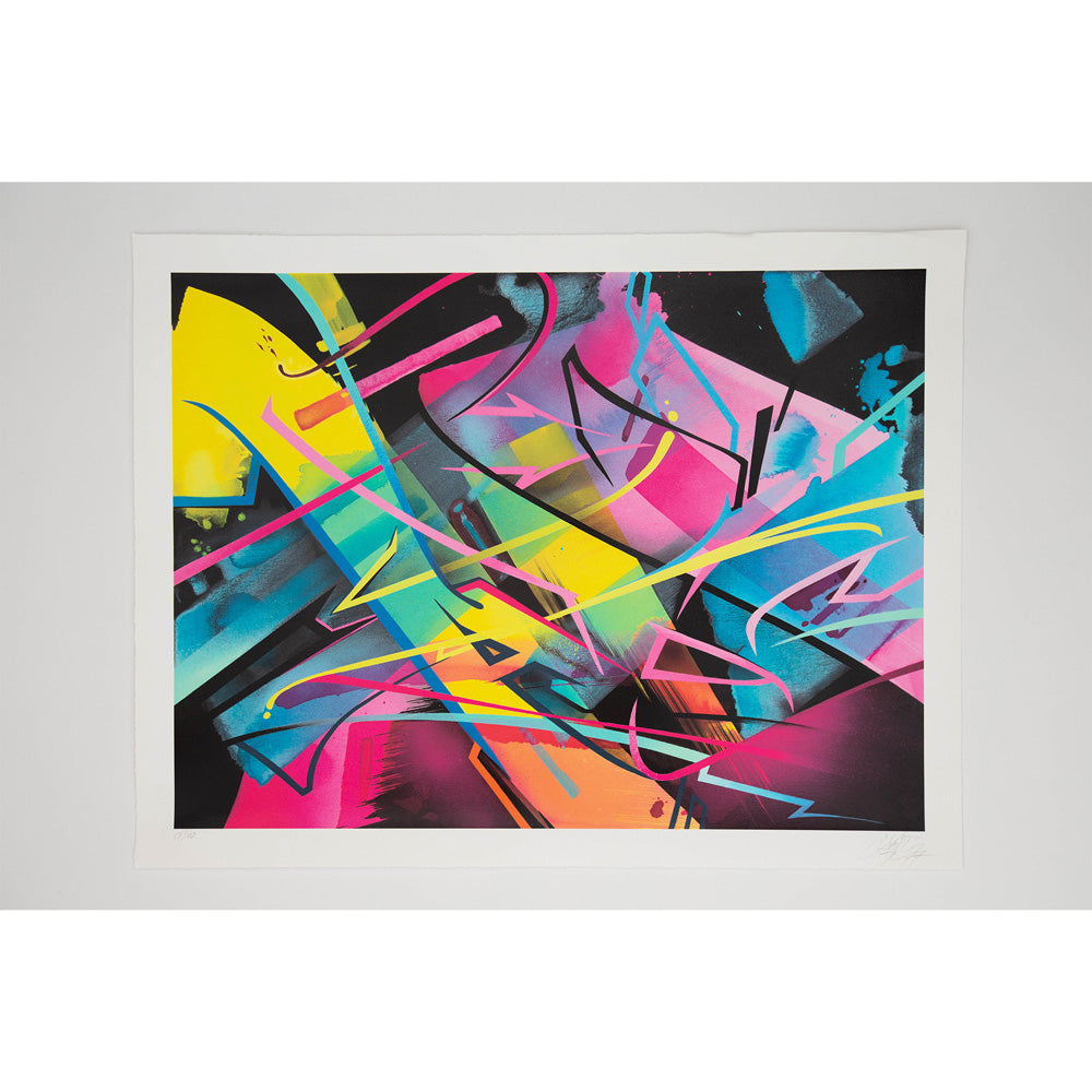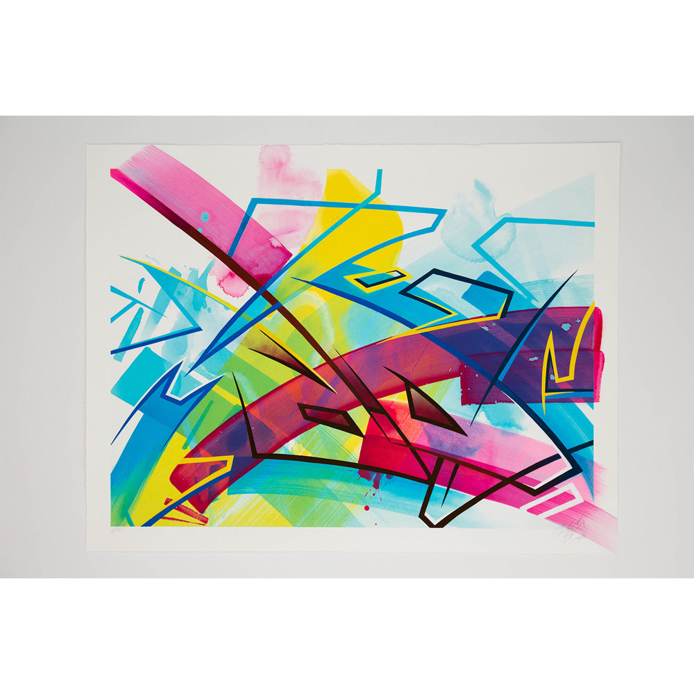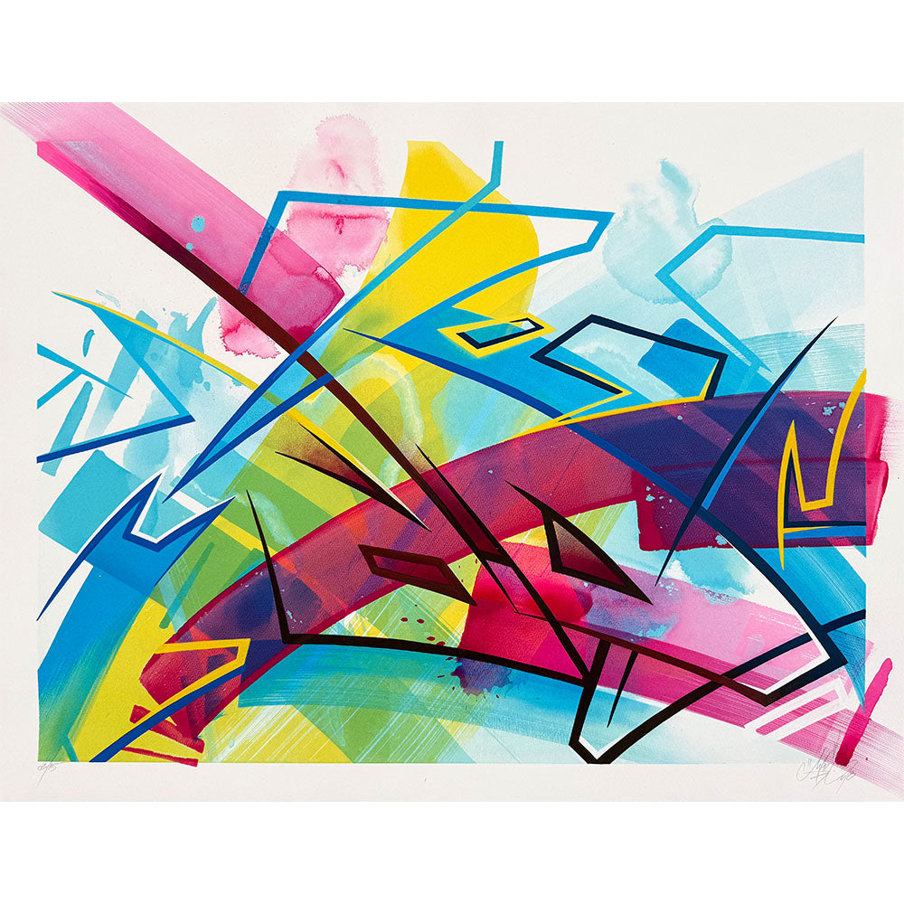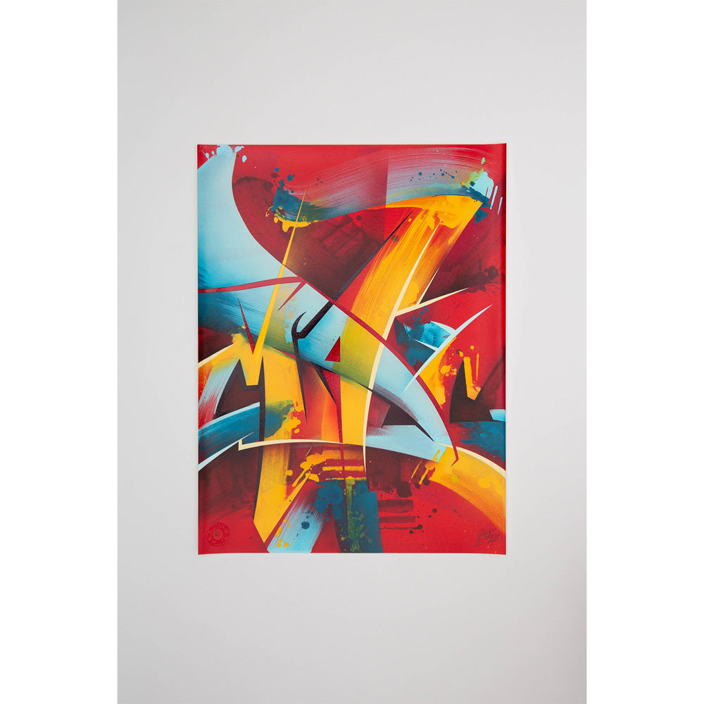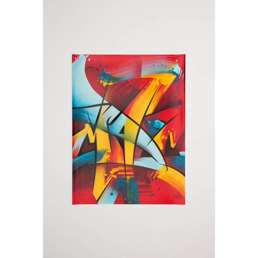 MadC was born as Claudia Walde in Germany in the 1980s. Throughout 25 years of constant engagement with art, in the streets as well as in galleries, she worked her way up from a teenager starting off with a spray can to one of the world’s top urban contemporary artists. MadC’s style has its roots in graffiti art, resulting in vividly colored, dynamic calligraphy and transparency where all layers shine through and thereby capture the energy of painting on a massive scale in the street, without using a direct graffiti language. Her unique use of color, composition and layering are perfectly paired with the spontaneously and fast painted lines of the calligrapher.