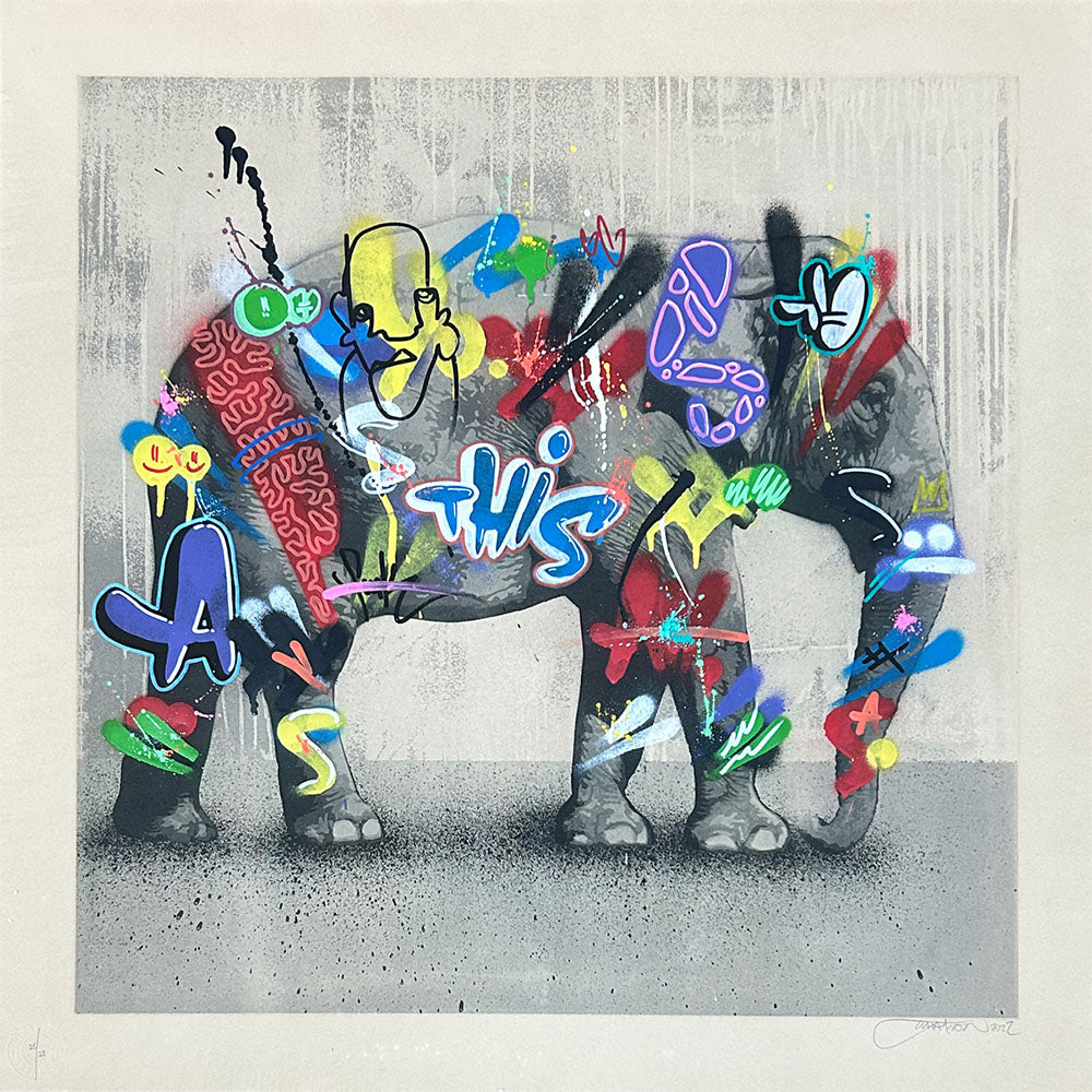 With as many works on walls as on canvas and paper, the relationship between vulnerability and strength remains constant in each work. Delicate and organic characters feature; butterflies, ballerinas and animals all rendered in empty grayscale space. Almost stylized, these minimal figures are constructed of a few layers of hand-cut stencils. The ashen tones of the compositions and vacant backgrounds are reminiscent of his alternative canvases, the concrete. True to form, no gray space stays gray for long in Martins presence. whether immersing entirely or embellishing a detail, the images disappear beneath expressive, spray-painted strokes of assorted colours and textures.