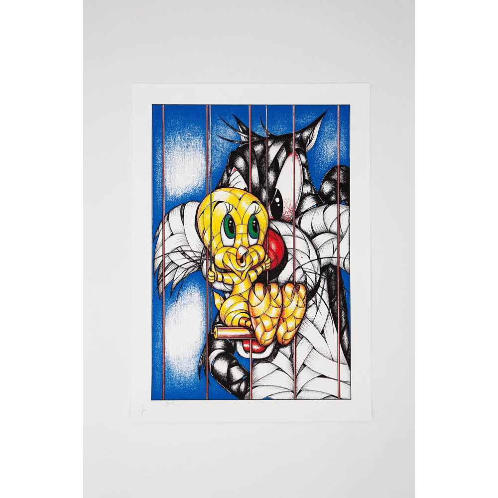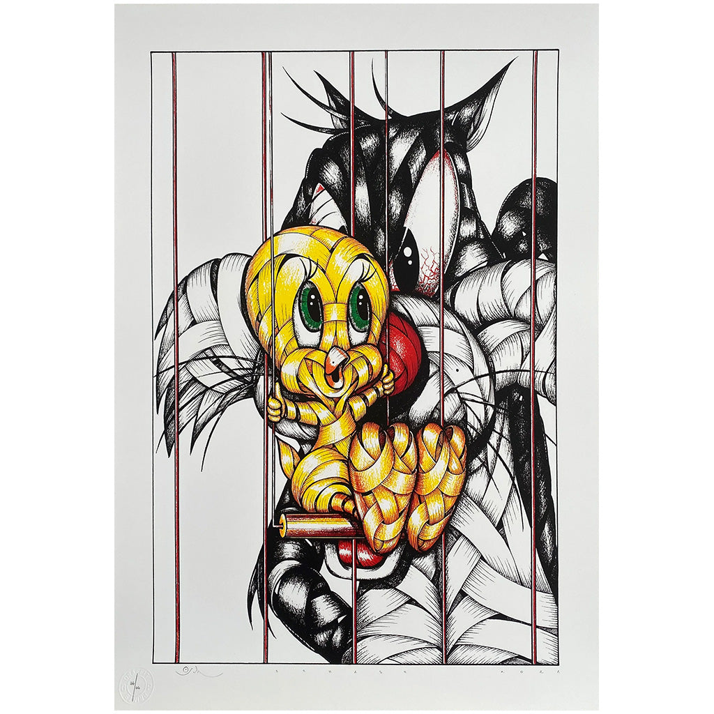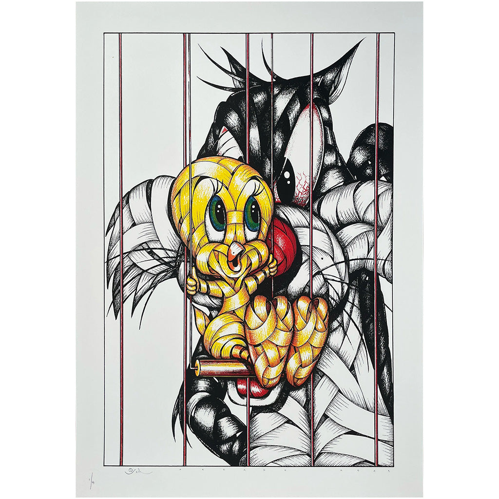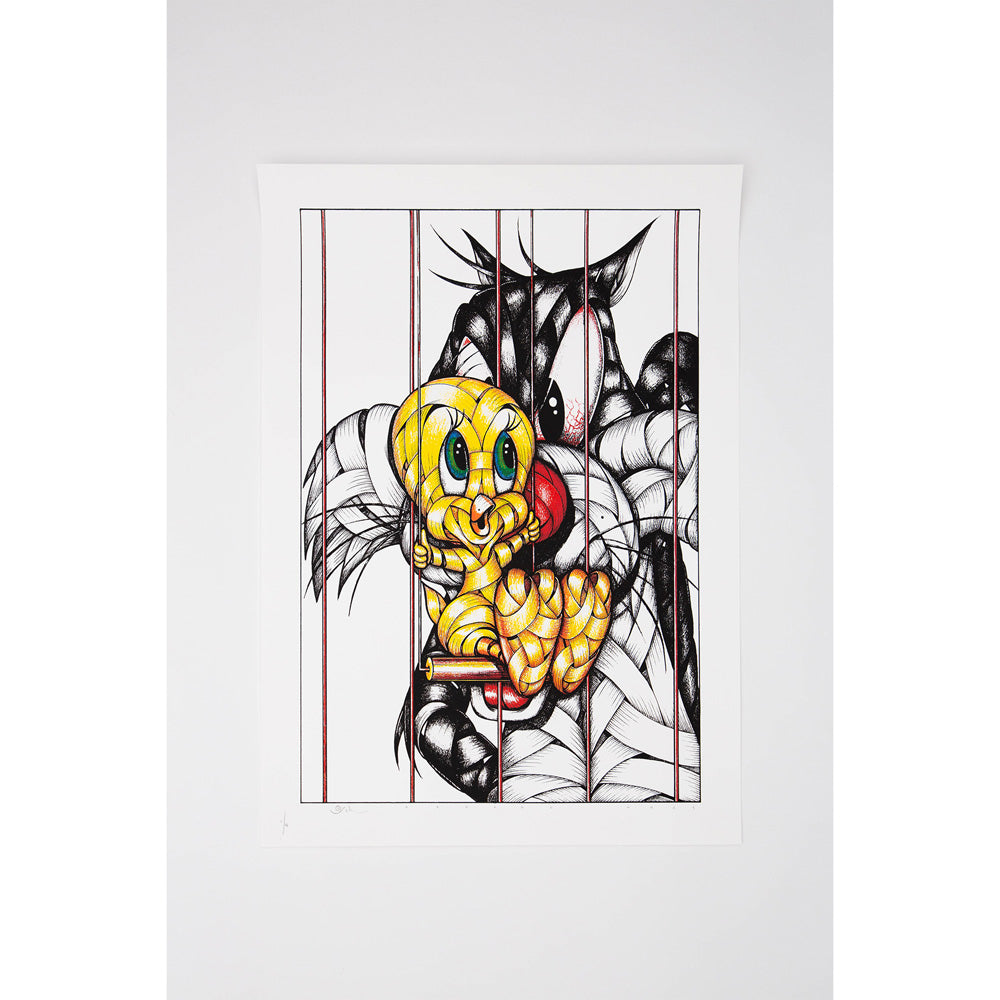 Otto Schade or ‘Osch’ is originally from Chili but is now living and working in London. His work is influenced by abstract and surrealism movements. The themes behind his compositions use iconic symbolism with a sharp, ironic touch. Otto’s paintings are unique in style with a refined technique – often characterized by ribbons which are painted meticulously in layers to produce his imagery.