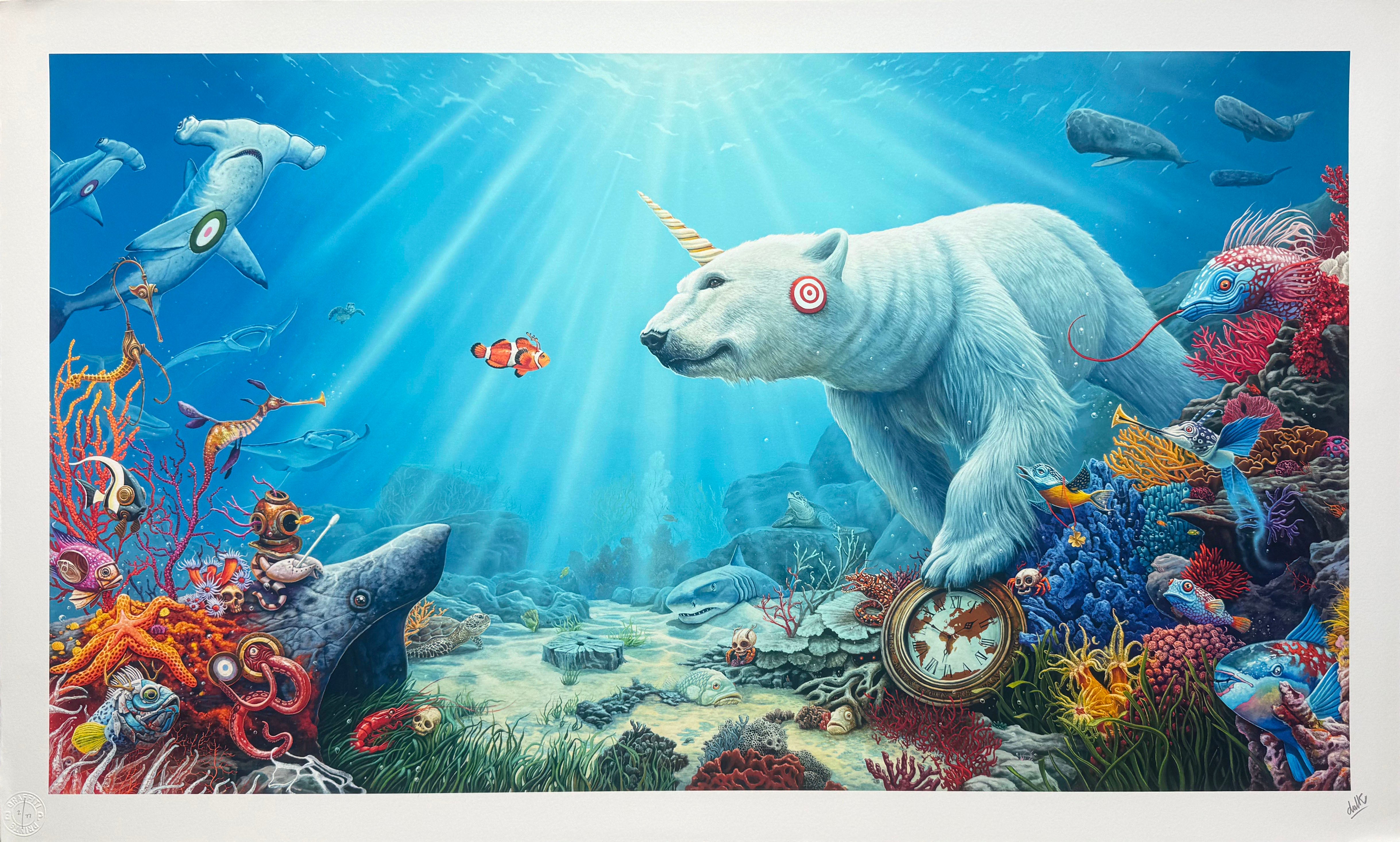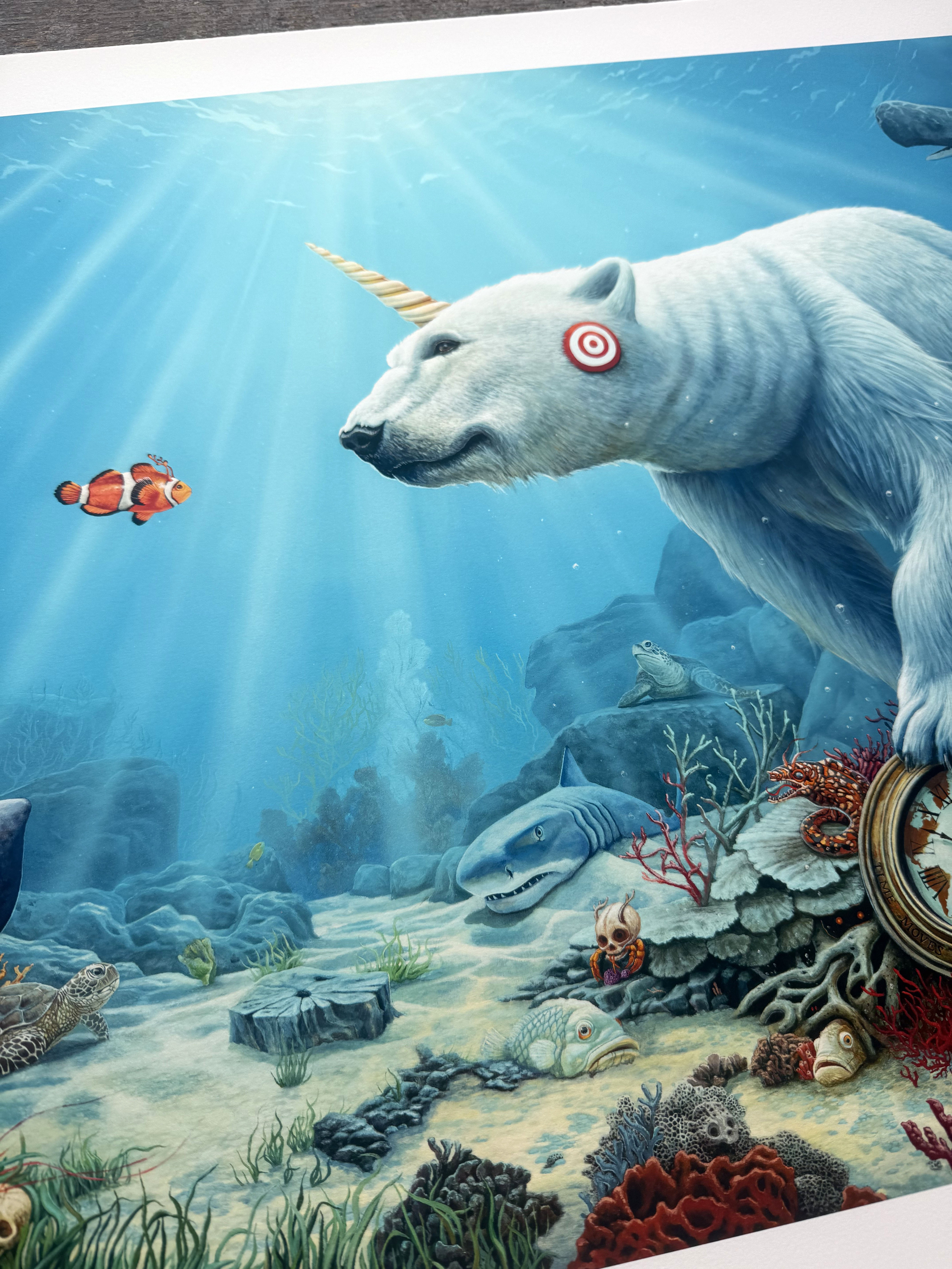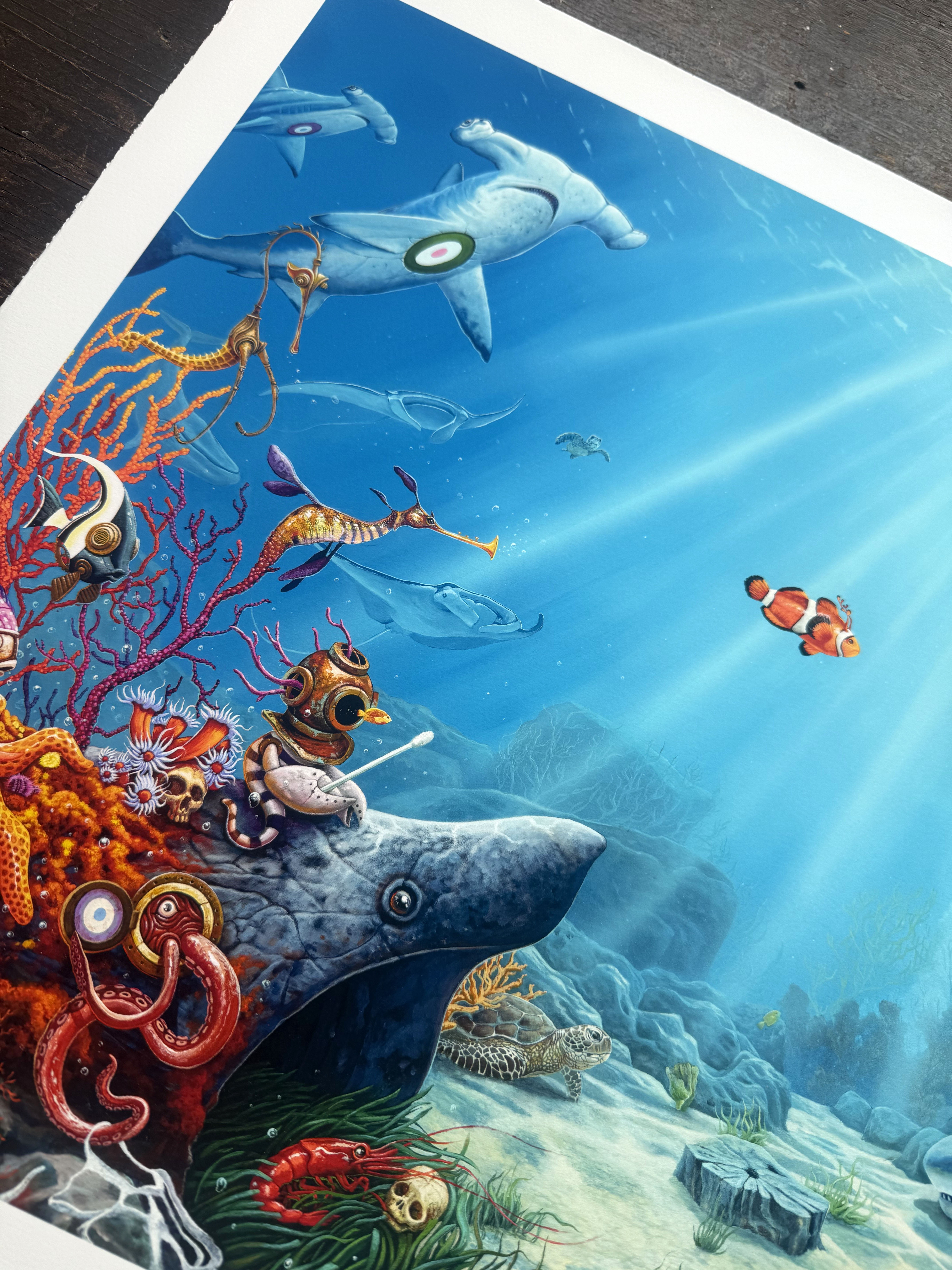 Giclee print with screen printed varnish effects.
